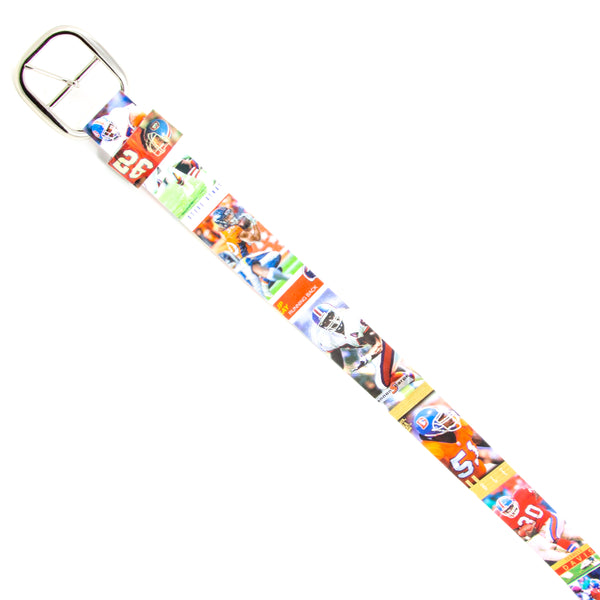 This Denver Broncos football card belt was handmade with Broncos cards from 1989-2020. It fits waist sizes 30-34. If this belt isn't built in your size you can order a custom fit Broncos belt here.