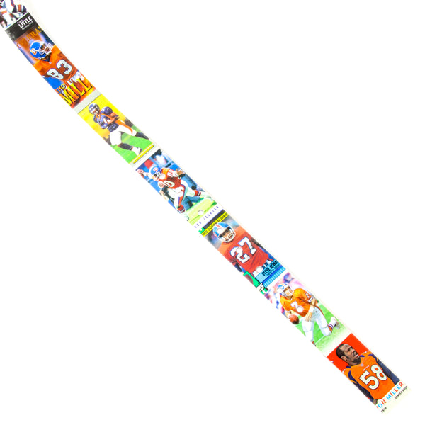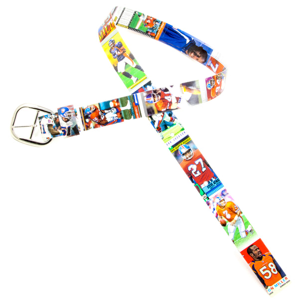 This Denver Broncos football card belt is built with football cards from 1990-2021. It fits waist sizes 31-36. If this belt isn't built in your size you can order a custom Denver Broncos card belt here.