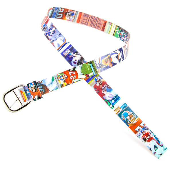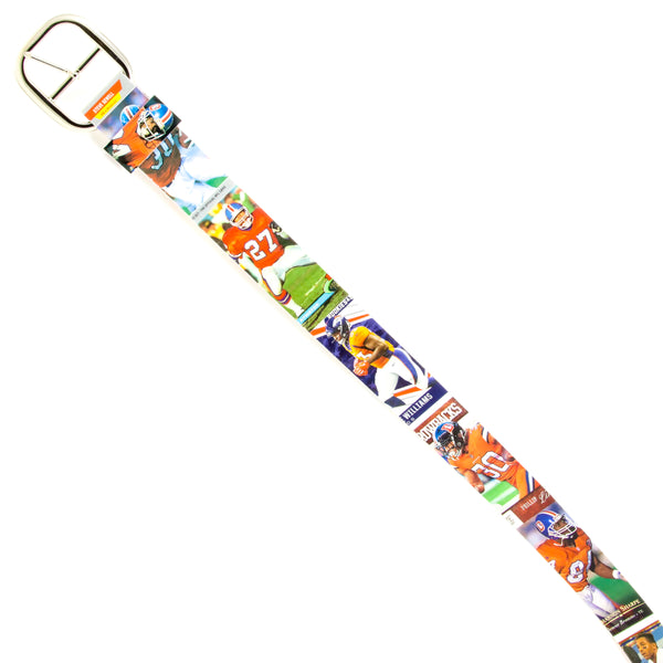 This Denver Broncos football card belt is built with football cards from 1987-2022. It fits waist sizes 33-37. If this belt isn't built in your size you can order a custom Denver Broncos card belt here.