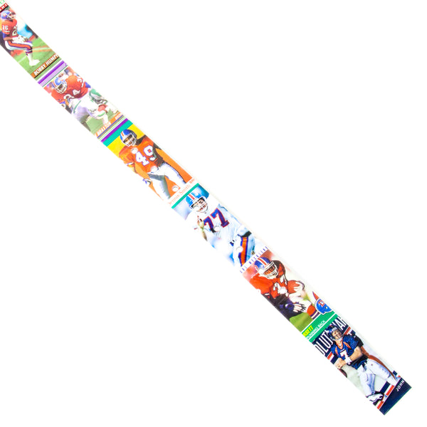 This Denver Broncos football card belt was handmade with Broncos cards from 1987-2022. It fits waist sizes 35-39. If this belt isn't built in your size you can order a custom fit Broncos belt here.